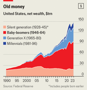 Baby-boomers were born between 1946 and 1964—and are the luckiest generation in history. Most of the cohort, which numbers 270m across the rich world, have not fought wars. Some got to see the Beatles live. They grew up with strong economic growth. Not all are rich, but in aggregate they have amassed great wealth, owing to a combination of falling interest rates, declining housebuilding and strong earnings. American baby-boomers, who make up 20% of the country’s population, own 52% of its net wealth, worth $76trn (see chart 1).