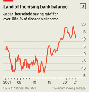 In Canada the saving rate of people over the age of 65 fell during the 2000s. But around 2015, after boomers had started to retire, the decline stopped. More recently the rate has risen. In South Korea from 2019 to 2023 the saving rate of over-65s jumped from 26% to 29%, a bigger rise than in other age groups. In Britain retirees are spending an ever-smaller share of what is coming in. In Australia in the early 2000s, people over 65 saved next to none of their income. In 2022 they saved 14% of it. In Germany from 2017 to 2022 the saving rate for retired folk rose from 17% to 22%. And in Japan the old-age saving rate has soared (see chart 3). Pensioners account for about 40% of total consumer spending in Japan, less than they did a decade ago, even though there are far more of them.