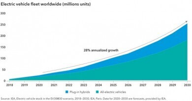Renewable energy has historically been perceived as expensive, impractical and unprofitable — but all that is quickly changing. Some traditional utilities are already generating more than 30% of their business from renewables and are reaching an inflection point where they are being recognized more as growth companies rather than just staid, old-economy power generators and grid operators. The move toward renewables is most pronounced in European utilities, where their governments have set high decarbonization targets. For example, the Renewable Energy Directive stipulates that a minimum of 32% of energy in the European Union should come from renewable resources by 2030.